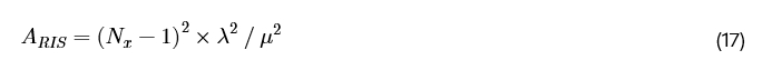 鉴于 RIS 工作在 f_c,波长是 λ = c / f_c。典型的 RIS 元件间距可以是 λ/μ,其中 μ ∈ (2,8) [37]。因此,对于一个每行有 N_x 个元件的方形 RIS,其表面积由下式给出