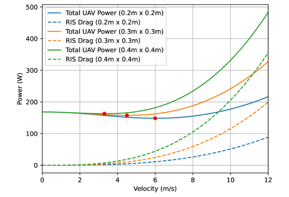 图 2: 更大的 RIS 表面导致更高的阻力,特别是在更高速度下导致功耗增加,红色标记指示了每种情况下最节能的速度。该图表明,包含由 Aerial-STAR 引起的空气动力阻力非常重要,尤其是在面积和速度值较高时。
