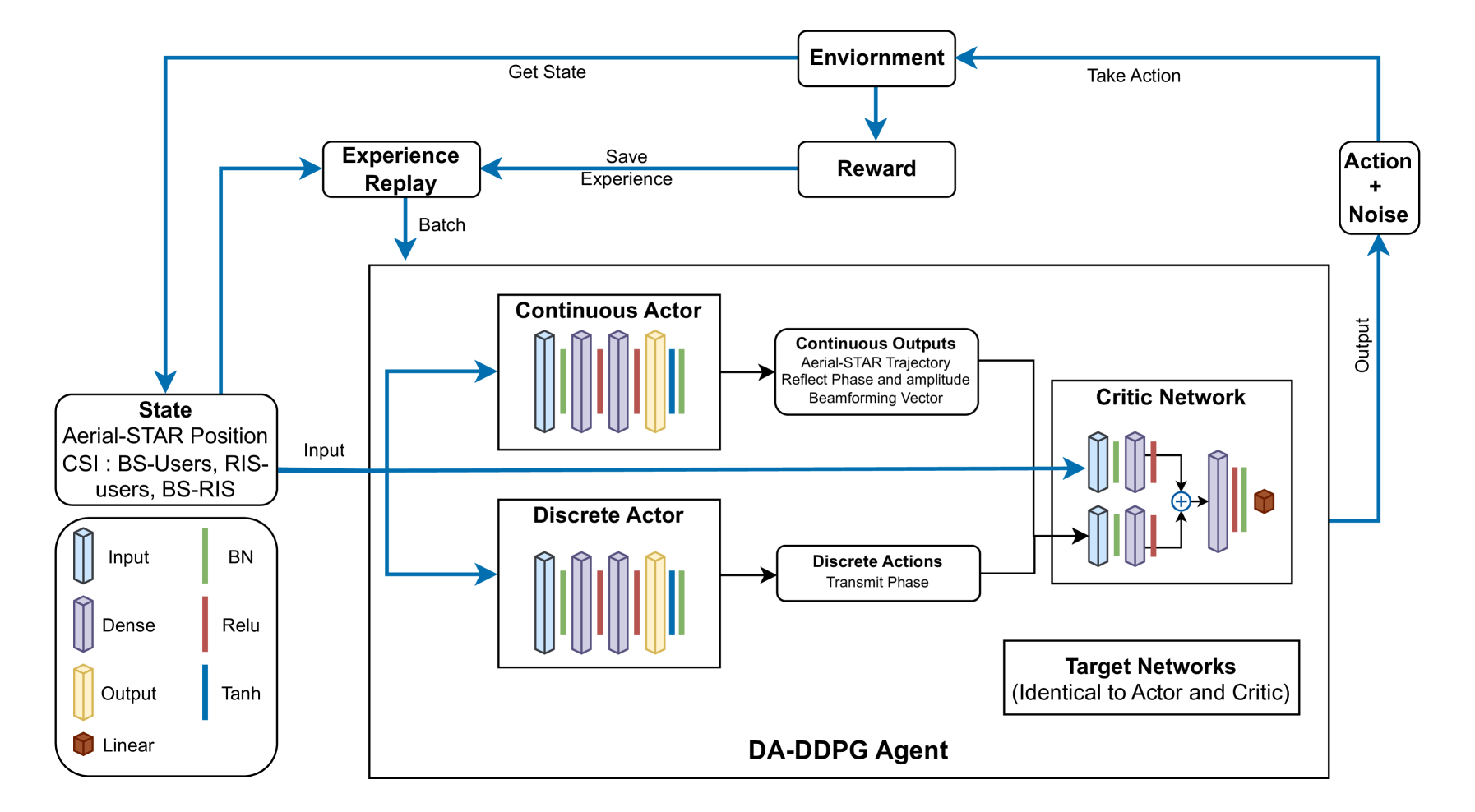 对文献的分析揭示了现有研究工作中的几个局限性。虽然许多工作集中于使用传统的仅反射RIS[27, 14, 10],其服务区域有限,仅限于反射空间,但一些工作通过采用STAR-RIS[28, 29]克服了这一限制。然而,它们通常假设存在预先安装的支持基础设施,而这可能并不总是可用。另一个挑战来自固定的RIS安装,它们可能并不总是与移动用户有视距(LoS)信道,尤其是在城市场景中。无人机搭载的STAR-RIS被提出来解决这些问题[22, 14],但大多数研究假设任意的相位系数,这对于无源RIS来说是不切实际的。由于相互依赖性,STAR-RIS的耦合透射和反射波束成形的有效设计具有挑战性。这种复杂性需要一个允许集成连续和离散动作的控制方案——这是现有相关算法难以满足的要求,因为这些算法是为相对较小的动作空间设计的[24],由于RIS涉及的大动作维度[21]。此外,通过专门的网络分别处理这些动作可能会带来改进的性能。考虑到现有研究的局限性和所涉及的挑战,我们提出了一种DA-DDPG算法,具有两个专门的Actor,每个Actor设计用于独立处理连续和离散动作。这种方法利用混合Actor-Critic方法的最新进展来解决高维动作空间。