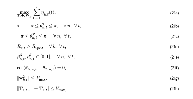 其中 (21a) 表示最大化能量效率的目标函数,(21b) 和 (21c) 是 TRC 相移的范围约束,(21d) 表示最低数据速率约束。(21e) 将幅度响应限制在合法范围内,(21f) 规定了透射和反射系数之间的耦合约束,(21g) 是最大功率约束,(21h) 约束了 Aerial-STAR 系统的最大速度。