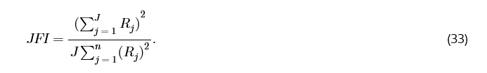 在无线网络中,公平性度量通常用于衡量资源分配的均匀程度。最常用的度量是 Jain 公平指数(JFI),由 [40] 引入,其定义为: