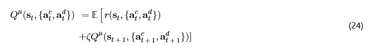 DA-DDPG 算法旨在最大化从每个状态 st开始的期望累积奖励。这是通过为每个状态 st确定最优动作 {at^c, at^d} 来实现的。具体来说,该算法寻求找到能最大化期望回报的动作,即从状态 st开始的折现未来奖励之和。数学上,目标是最大化价值函数 Q_μ( st, {at^c, at^d} ),它表示在状态 st下采取动作 {at^c, at^d} 并 thereafter 遵循最优策略的期望累积奖励,使用贝尔曼方程表示: