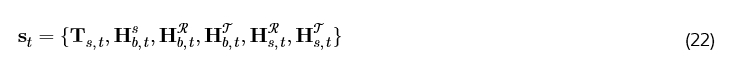 在我们的案例中,智能体是一个网络控制器,可以放置在 Aerial-STAR 上以降低延迟并实时采取动作,或者可以是与 Aerial-STAR 有 LoS 链路的基站,这有助于减少 UAV 的计算量。智能体观察当前状态 s_t ∈ S,其中 S 表示状态空间。基于这个状态观察,智能体从动作空间 A 中选择一个动作 a_t ∈ A。对于每个 t,s_t 具有维度 (3 + 2 M N + 2 M J + 2 N J),并包含关于 Aerial-STAR 位置和信道信息的信息,由下式给出: