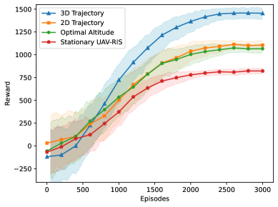 图 5 比较了三种不同 RL 解决方案在 3000 个 episode 中的奖励累积情况。选择 DDPG 和 DQN 作为基准,因为它们是基础性的,并且在文献中广泛用于优化 RIS 系数和无人机轨迹。对于学习率 0.0001,DA-DDPG 收集的奖励分别比 DDPG 和 DQN 高 24% 和 97%。标准的 DDPG 使用单一的 Actor 网络处理两种动作类型,性能明显优于 DQN,但效率低于 DA-DDPG。DDPG 具有与 DA-DDPG 相似的架构,但使用单一的 Actor 网络来处理离散和连续(阈值化后的)动作。虽然更简单的架构可能使其更容易训练,但 DDPG 难以处理混合动作空间的复杂性。DQN 仅限于离散输出,在三种算法中表现最差。这些改进突显了 DA-DDPG 分离的 Actor 网络方法在处理混合动作空间方面的显著优势,有效地平衡了连续和离散动作的学习。图 5 也说明了学习率的影响,lr=0.01 作为更大的步长,对于我们这个复杂的问题收敛到更低的奖励。