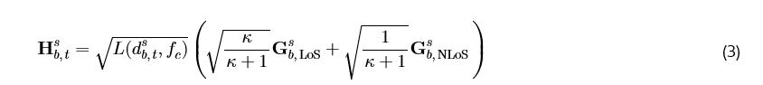 所有其他信道,即 H{b,t}^ℛ, H{b,t}^𝒯, H{s,t}^ℛ, H{s,t}^𝒯,被建模为瑞利衰落 (κ=0),因为它们的 LoS 传播不能保证。