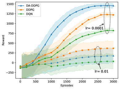 图 5:在不同学习率设置下,DA-DDPG、DDPG 和 DQN 的比较奖励图。
