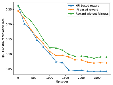 将公平性指数纳入奖励函数的影响如图 11 所示。它比较了不同奖励公式下的最低数据速率 QoS 约束违反率。图表显示,基于 HFI 和 JFI 的奖励都显著优于没有考虑公平性的基线奖励。值得注意的是,基于 HFI 的奖励始终实现最低的 QoS 约束违反率,在前 500 个 episode 内迅速下降到 0.10 以下,并且与基于 JFI 的奖励函数相比,最终改进了 41%。这是因为在高用户数据速率差异的场景中,HFI 比 JFI 施加了更高的惩罚,JFI 显示出类似的趋势但始终保持略高的违反率。这些结果强调了在奖励函数中纳入公平性度量的有效性。我们证明 HFI 能够以最低数据速率 QoS 约束服务更多用户,从而在所有用户中带来更一致的网络性能。