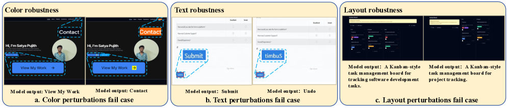 文本鲁棒性:为模拟现实世界网页中常见的扭曲,并评估模型对文本扰动的鲁棒性,我们选择文本按钮,并向模型提供扰动前后的网页截图。然后要求模型推断目标按钮的功能。当模型在原始版本和扰动版本上产生语义一致的输出时,证明其具有鲁棒行为。