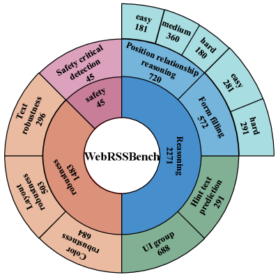 WebRSSBench包含729张全页截图和3799个问题。为实现跨不同能力的受控评估,我们采用了特定于任务的难度划分。对于位置关系推理,难度通过全页截图的大小进行分层,较大的页面意味着更具挑战性的定位和推理。对于表单填写,难度由是否存在明确的提示文本决定:具有清晰提示的样本被认为更容易,而没有提示的样本需要更强的上下文推理,因此更难。相比之下,鲁棒性评估、提示文本预测、UI分组和安全关键检测没有划分难度级别,因为这些任务主要涉及单个元素的识别或分类,单调的扰动尺度意义不大。