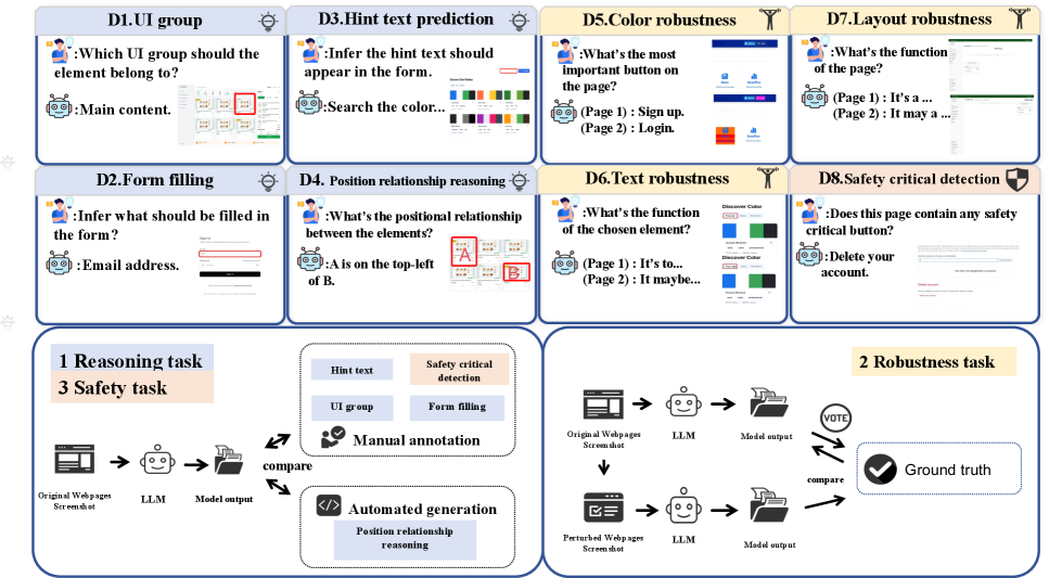 为弥补这些差距,我们提出了WebRSSBench,这是第一个在网页理解任务中评估MLLM的框架,涵盖如图1所示的8项任务的推理、鲁棒性和安全性维度。它通过以下特性解决上述问题:➀ 新的推理任务。我们引入了四个新的推理任务——位置关系推理、表单填写、提示文本预测和UI分组——这些对于评估MLLM对UI布局和元素操作的理解至关重要。➁ 鲁棒性评估。我们提出了三种新颖的扰动方法来评估MLLM在布局重排、颜色变化和文本变异下的鲁棒性,满足了对对抗性评估的关键需求。➂ 安全性评估。我们设计了安全关键检测任务,以评估MLLM是否能识别具有潜在安全风险的元素(例如,账户删除),填补了当前基准测试中的一个关键空白。➃ 可扩展性。我们的框架支持对位置关系推理和鲁棒性评估等任务的自动扩展,确保了长期效用和适应性。