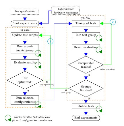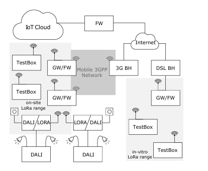 网关和测试硬件及其位置是一项实验分析的结果,该分析旨在利用地形的凹形形状来改善覆盖范围[14],目标设备数量为1500个,每个节点至少覆盖三个网关,见图6。测试配置进一步基于SLA的硬件、软件以及先前对部署进行的离线安全分析结果[15]进行选择。在每个测试批次期间,参数在实验室环境中进行验证和调整(图1左),并在现场进行复制和验证(图1右)。其次,每个周期(无论是实验室还是现场)都通过调整和重新设计测试方法来为下一次重复提供信息。