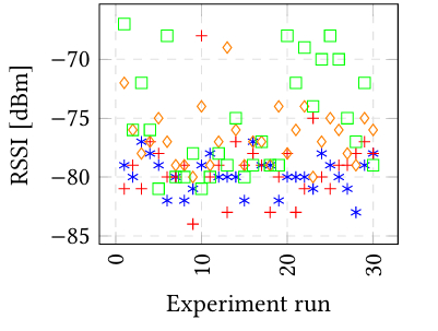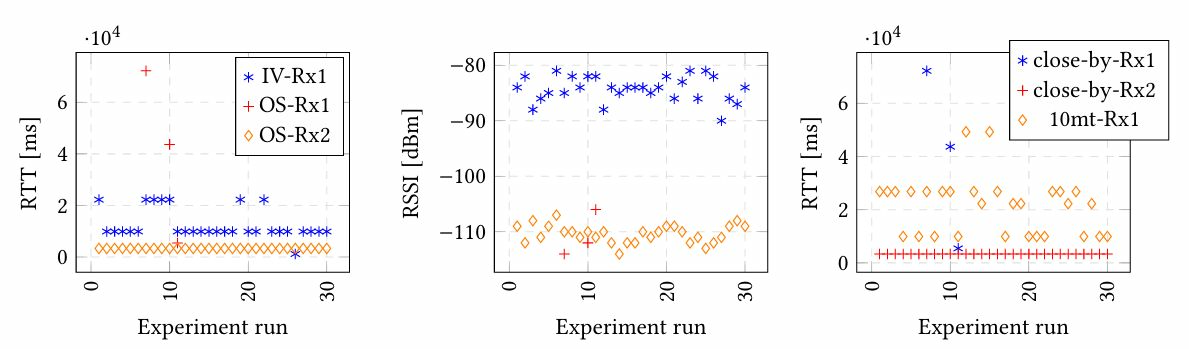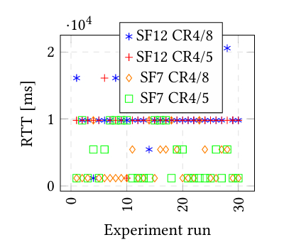 一个LorIoT Osprey 7.𝑥网络服务器记录流量数据以供分析。作为性能指标,我们使用确认传输的消息往返时间(RTT)或信号质量和成功率。前者结合了到网络服务器的传输空中时间、协议要求的暂停和重传间隔,以及响应的空中时间(取决于数据速率和重传次数,间接依赖于冲突和接收质量)。带时间戳的日志文件将捕获测试箱的输出和服务器日志。
