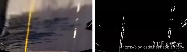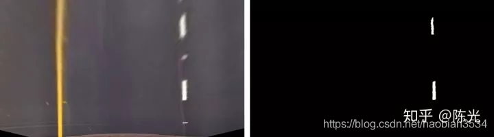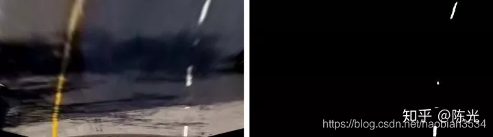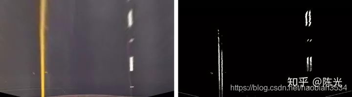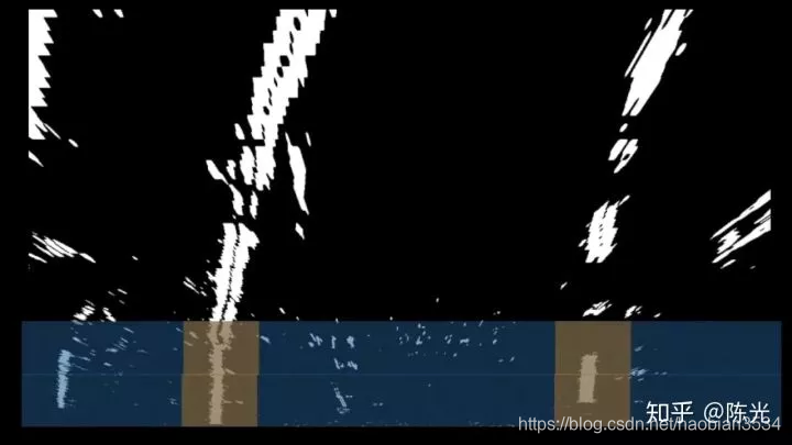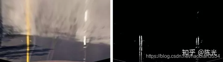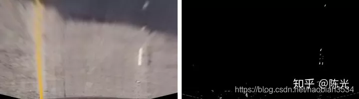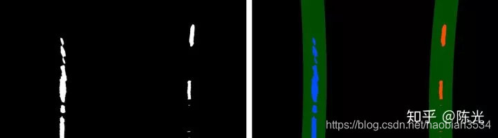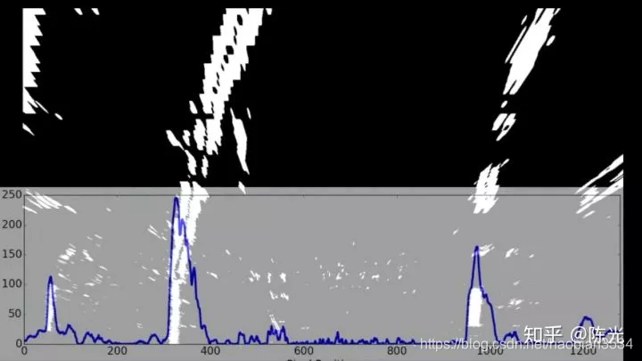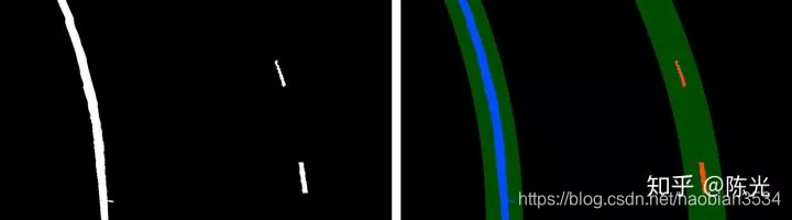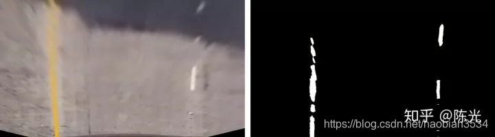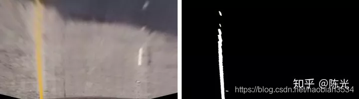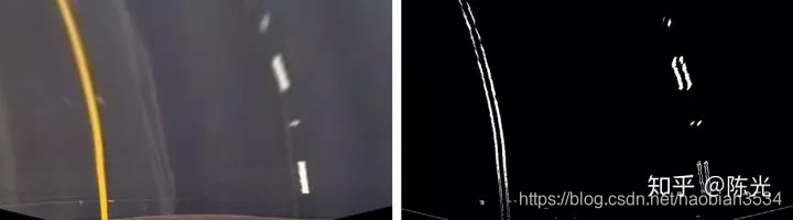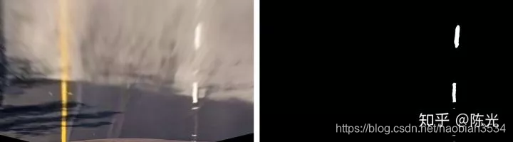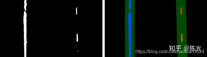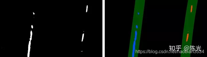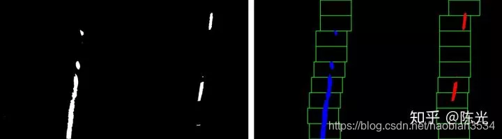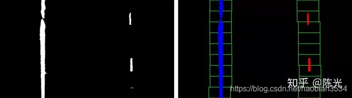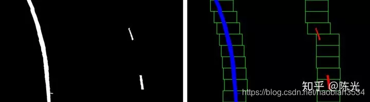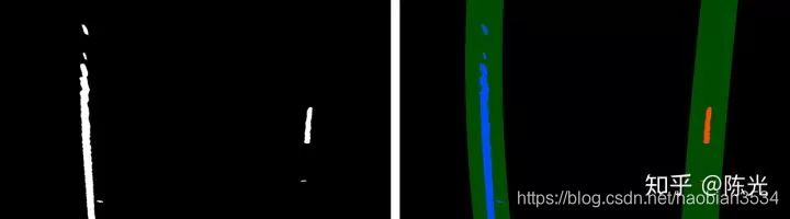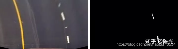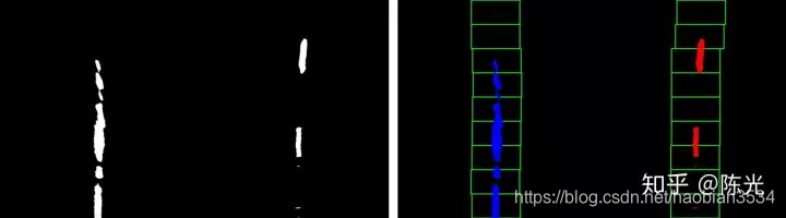 对鸟瞰图二值化,通过二值的像素点进一步区分左右两条车道线,从而拟合出车道线曲线。