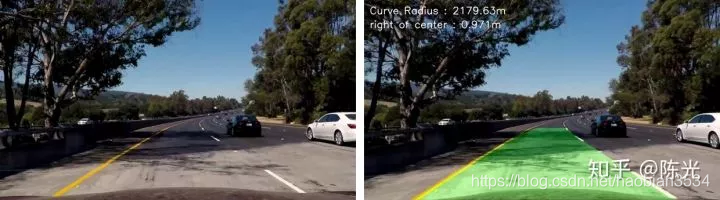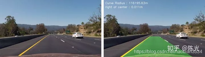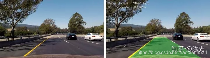 视频中左上角出现的道路曲率和车道偏离量的计算都是获取车道线曲线方程后的具体应用,这里不做详细讨论