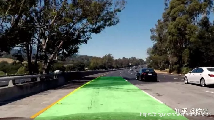 我们将两条车道线所围成的区域涂成绿色,并将结果绘制在“鸟瞰图”上后,使用逆透视变换矩阵反投到原图上,即可实现在原图上的可视化效果。代码如下: