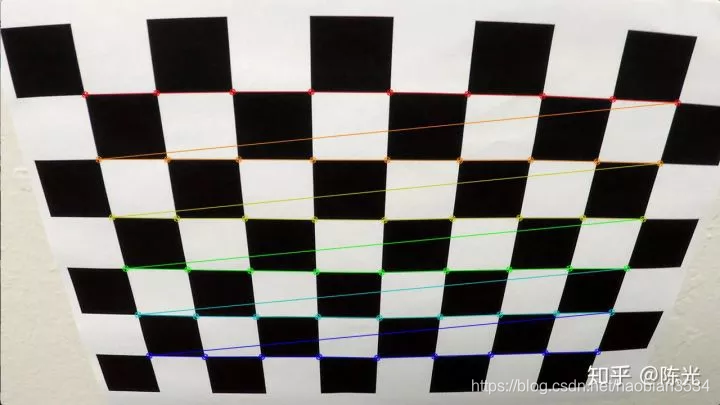 以畸变的棋盘格图像为例,进行畸变修正处理