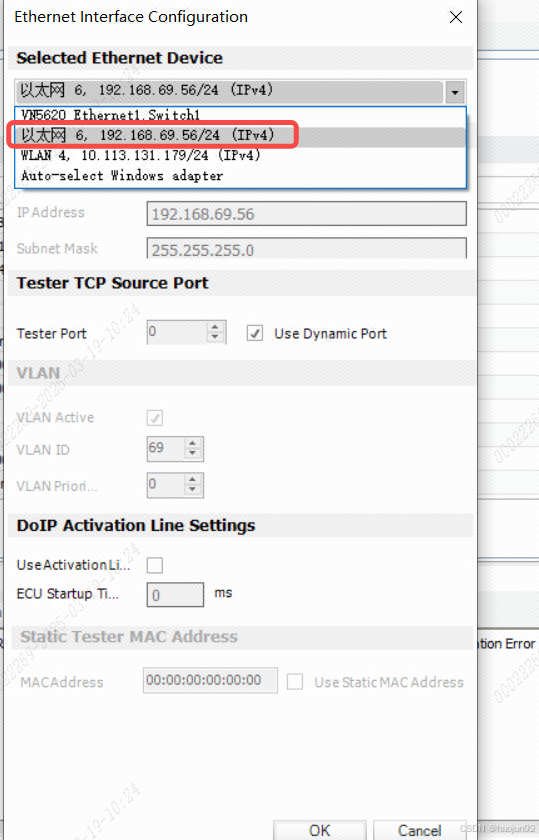 Selected Ethernet Device这里可支持的以太网,比如VN5620,或者本地PC配好的能跟ECU通信的网段,其他的配置项默认