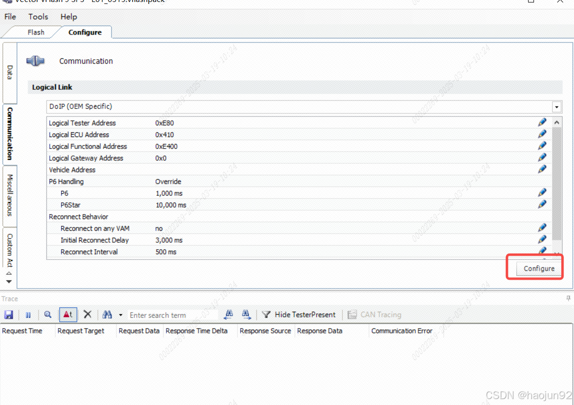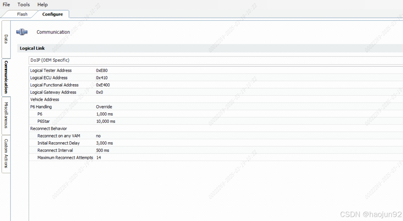 点击左侧的communicatio页面,选择Logical link下拉框,项目中用的是OEM定制化的DoIP,故选择DoIP(OEM Specific)