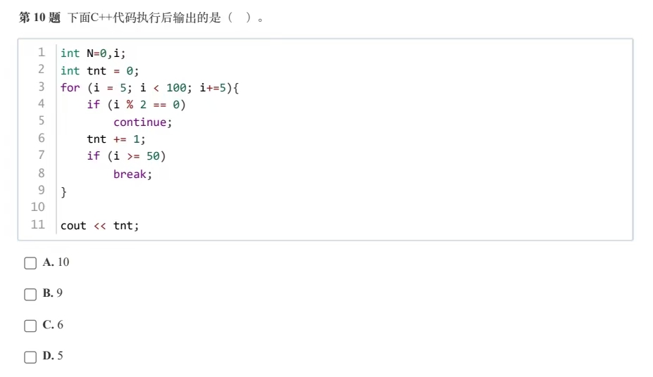 分析:for循环里面i从五开始,循环范围是100以内的整数,步长为5,然后判断i能不能被2整除,如果能那就跳过本次循环(continue),如果不能那就让tnt+1,然后判断i是否大于等于50,如果大于等于50,那就终止循环(break),最后输出tnt。不过要注意的是,55也要加1,因为是先加1,再判断是否大于等于50,所以有5,15,25,35,45,55要执行tnt+1操作,一共执行6次,所以答案是c。