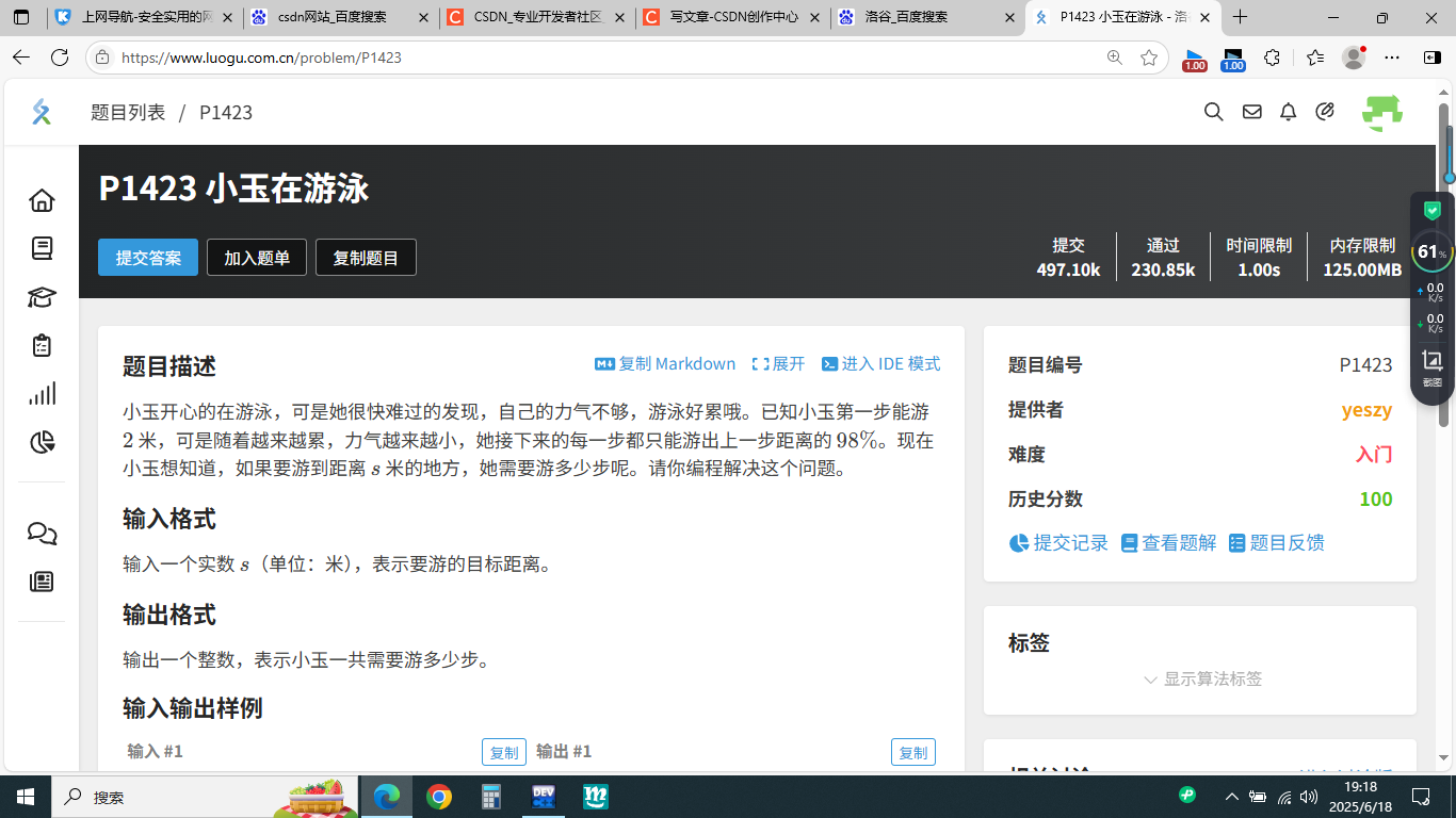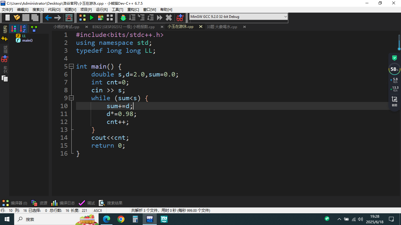 这里的难点是while循环里面,有的人会把两条语句写反掉,应该是sum+=d;d*=0.98;而不是d*=0.98;sum+=d;因为题目说第一步能游2米,说明第一步也要算进去,程序如下: