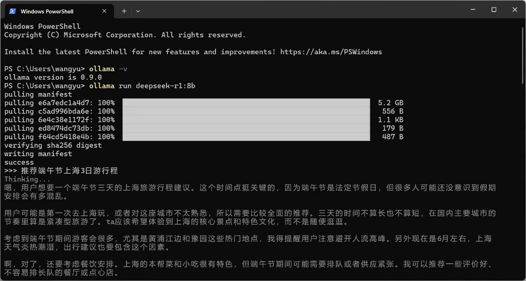 - 在控制台执行一条ollama指令下载指定的模型,比如ollama run deepseek-r1:8b 即为下载80亿参数的DeepSeek-R1-0528版本,等下载完成,即可愉快地对话啦。