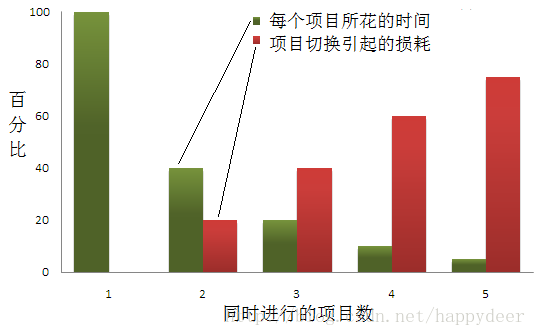 根据Weinberg的计算,哪怕只是在你的工作负荷中增加一个项目,也会严重地影响你的效率。你会损失20%的时间。当你增加第三个项目的时候,你有将近一半的时间浪费在任务切换上面。