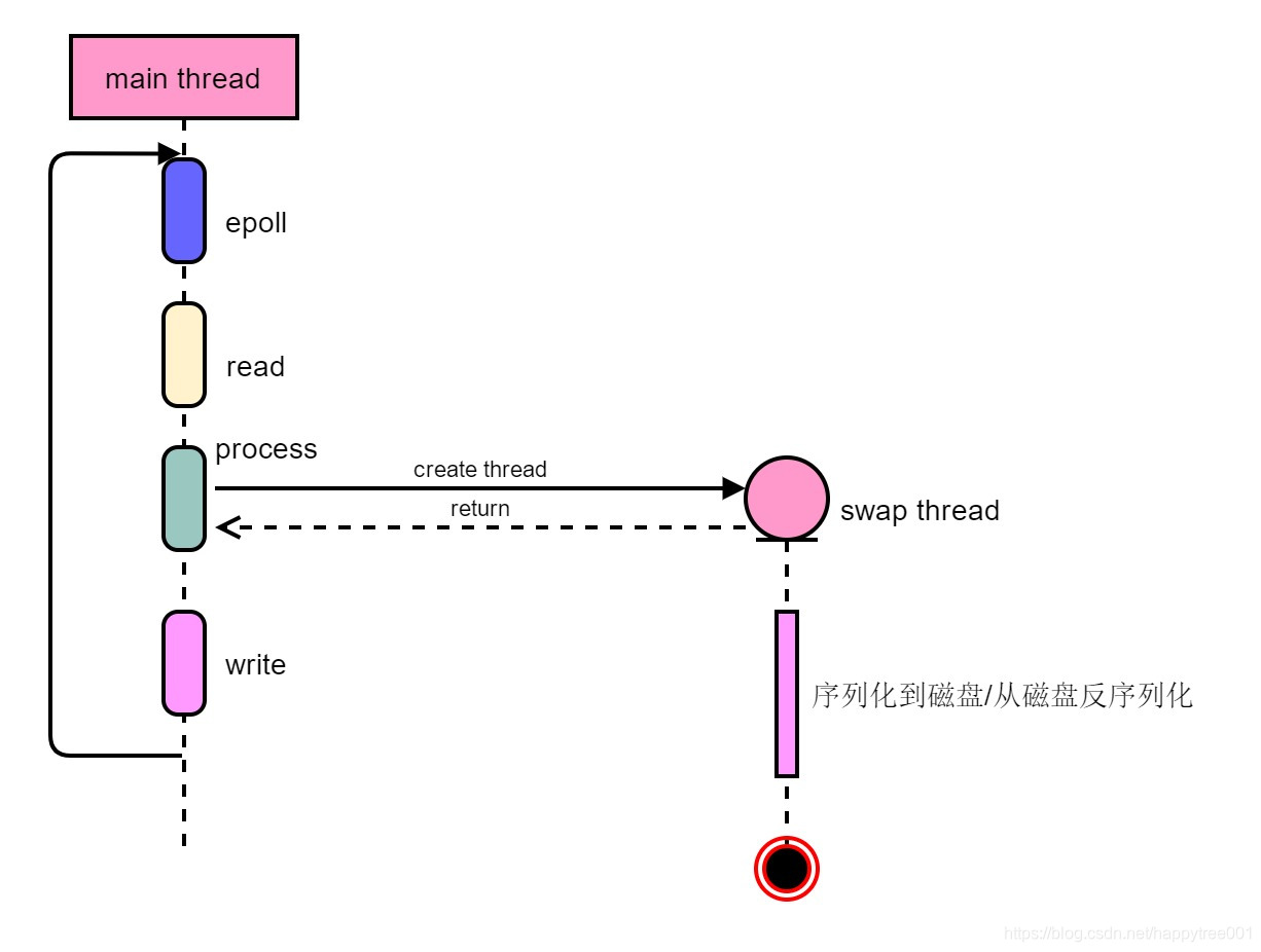 redis在2.0.0中引入了swap功能,即在内存不足的情况下,将内存中的对象序列化到磁盘上,腾出内存空间为其他对象使用;当需要被序列化到磁盘上的对象时,又将内存中最久未使用的对象序列化到磁盘上,并反序列化磁盘上的对象,加载到内存中。因磁盘io操作是非常耗时的,所以将写磁盘的工作交给了线程去处理。