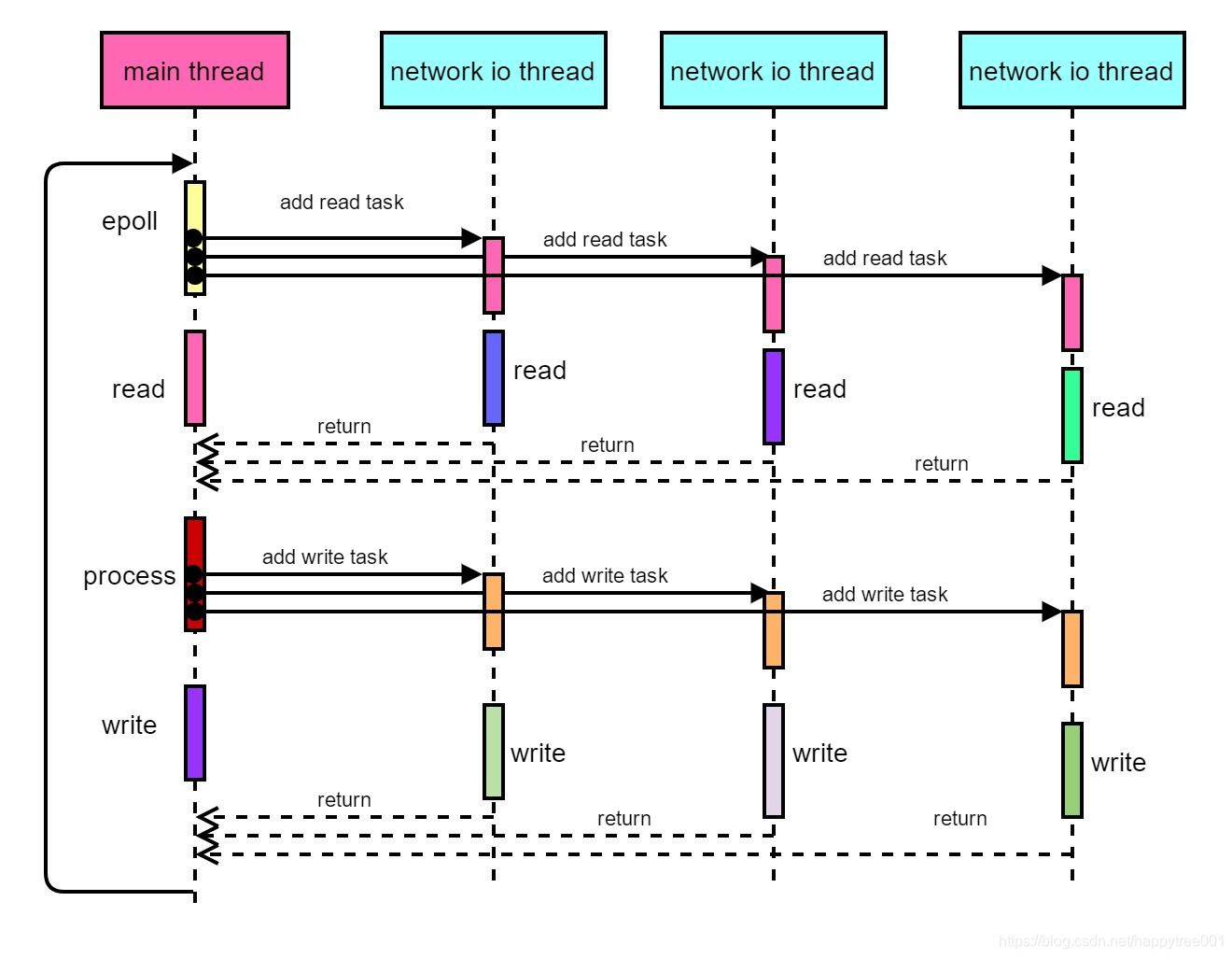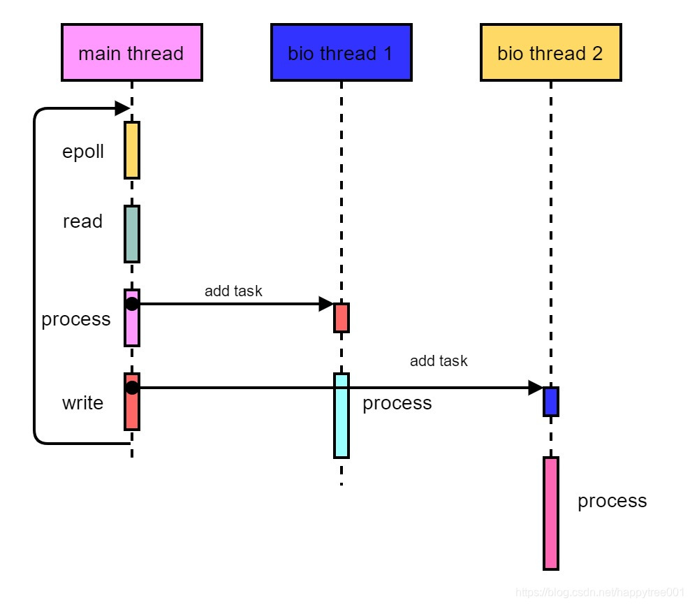 网络io线程同时只能处理读或者写,读写完成后,将执行权交给主线程。