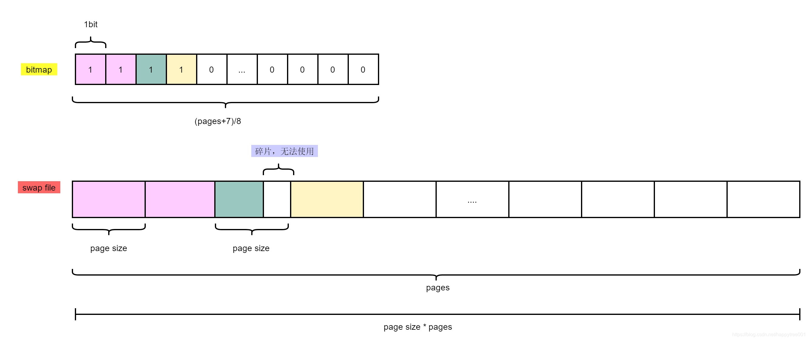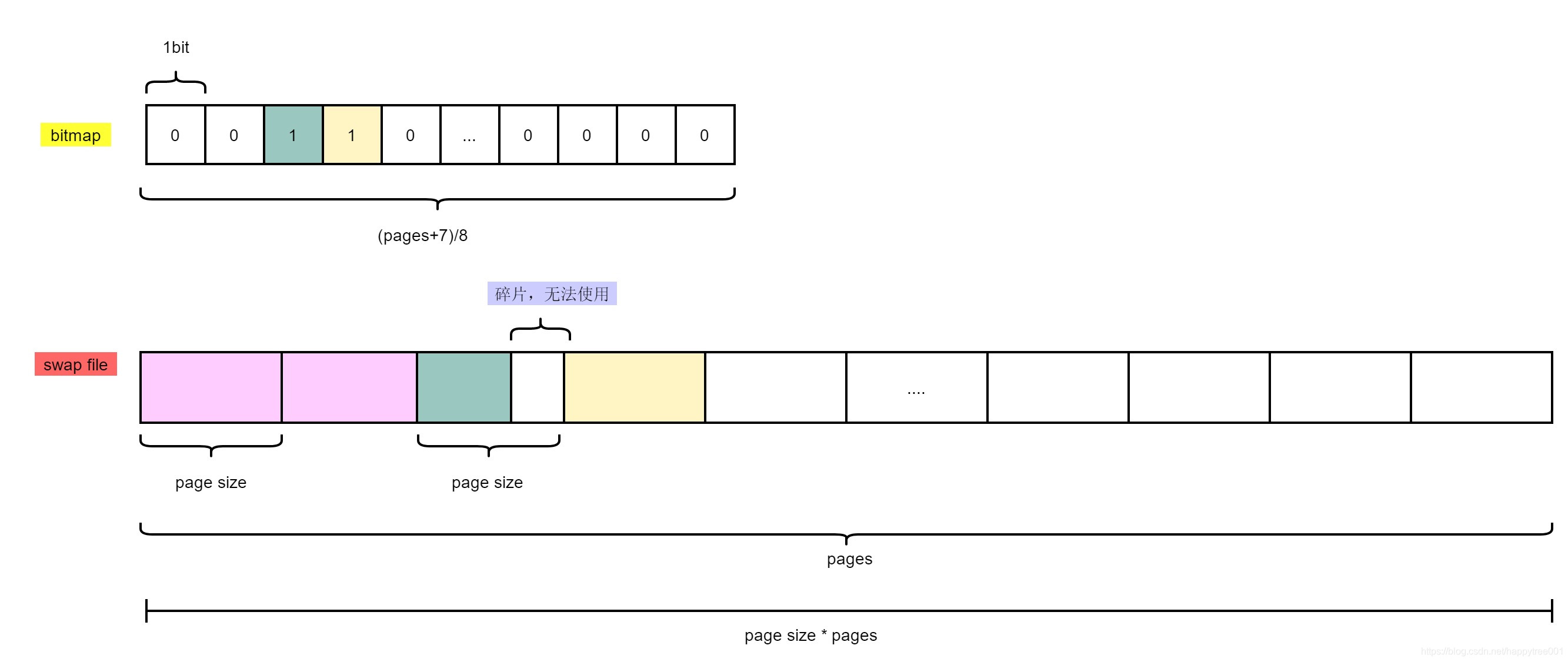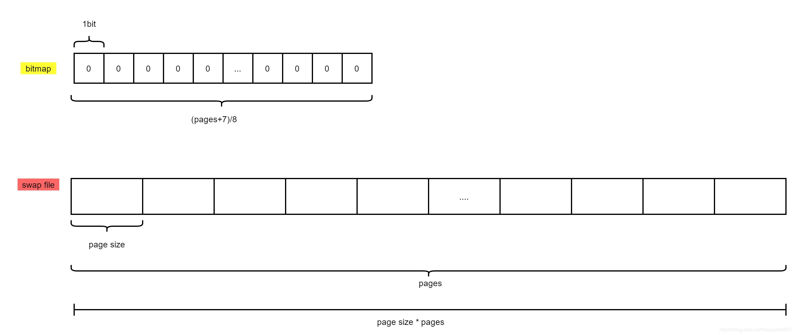 分配一个page_size * pages 的文件, 以及一个(pages+7)/8大小的位图,用于标记swap文件中哪些page已经使用,哪些没有使用