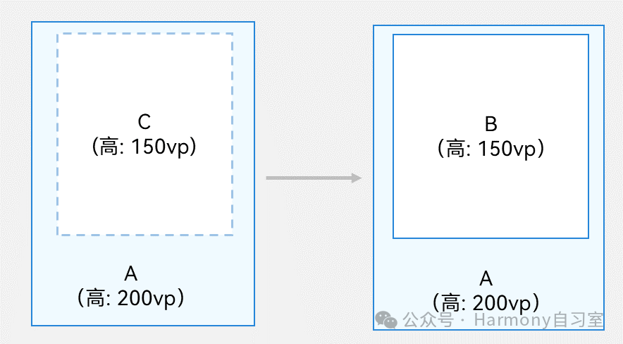 如下图所示,同样是没有设置高度的垂直列表B,其父组件A高度为200vp,若其所有子组件C的高度总和为300vp,则此时列表B的高度为200vp。列表主轴高度约束示例2(A: List的父组件; B: List组件; C: List的所有子组件)