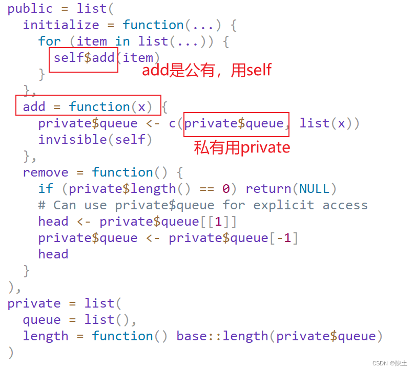 公有成员使用self(如self$add())访问,而私有成员使用private(如private$queue)访问。