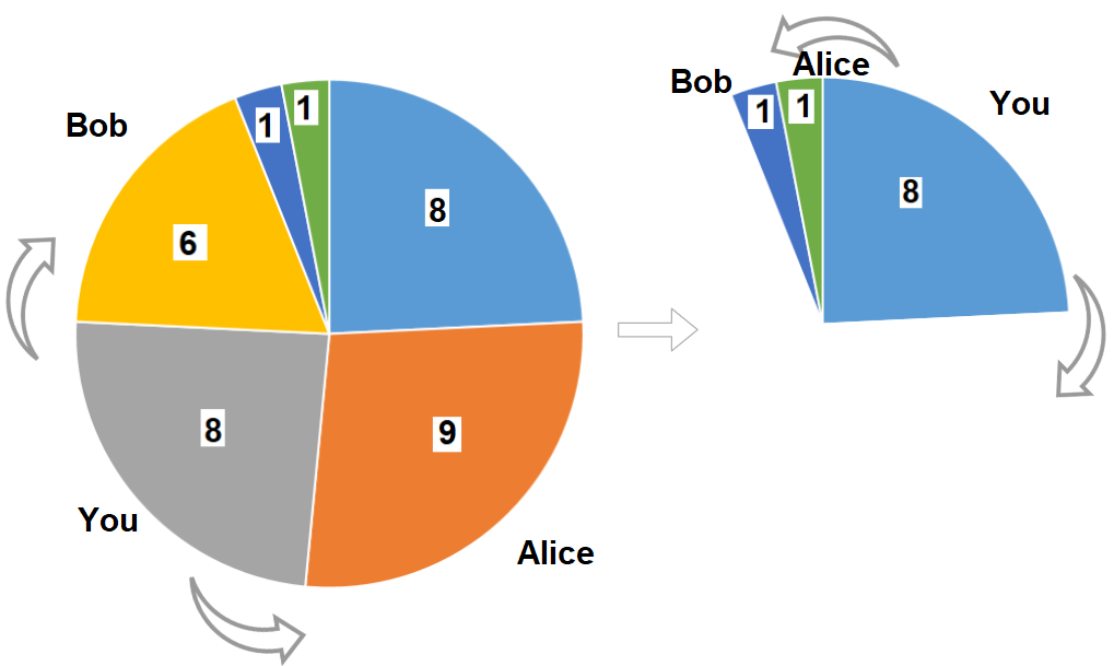 Alice 将会挑选你所选择的披萨逆时针方向的下一块披萨。