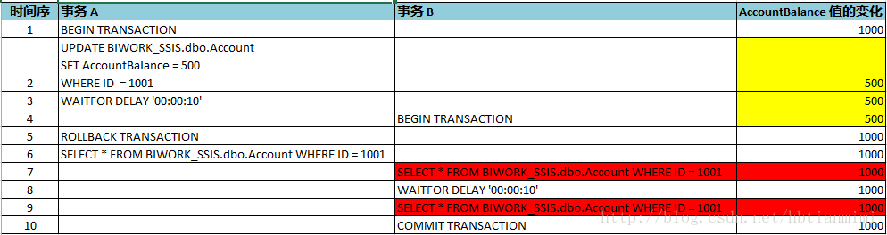 注:上面的时序图只是用来帮助理解事务的隔离级别,只是一个大概的执行顺序,当然也跟我执行事务 A 和 事务 B 的时间点相关,所以并不能真正反映实际过程中 SQL 语句提交和执行的实际顺序,真正提交的过程可以通过 SQL Profiler 去跟踪看看。