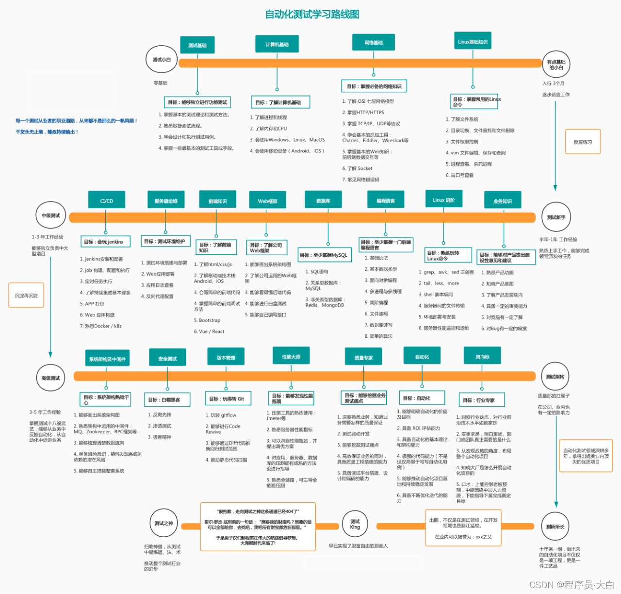 当然这里介绍的都是简单的,最基本的实现方案,作为入门学习比较合适。其他五花八门的二次开发的框架,包含众多功能的方案留待你以后提升。先从这几方面了解入手,选择一个语言体系,建议从接口自动化入后,然后再去学习页面和app。