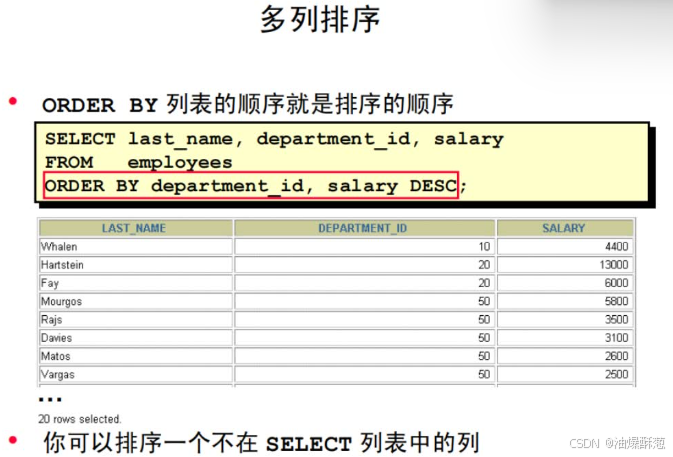 使用ORDER BY排序 在一个不明确的查询结果中排序返回的行。ORDER BY子句用于排序。如果使用了ORDER BY子句,它必须位于SQL语句的最后。1.FROM子句 2.WHERE子句 3.SELECT子句 4.ORDER BY子句。示例一:查询employees表中的所有雇员,显示他们的ID、名字与薪水,并按薪水升序排序。示例二:查询employees表中的所有雇员,显示他们的ID与名字,并按雇员名字降序排序。