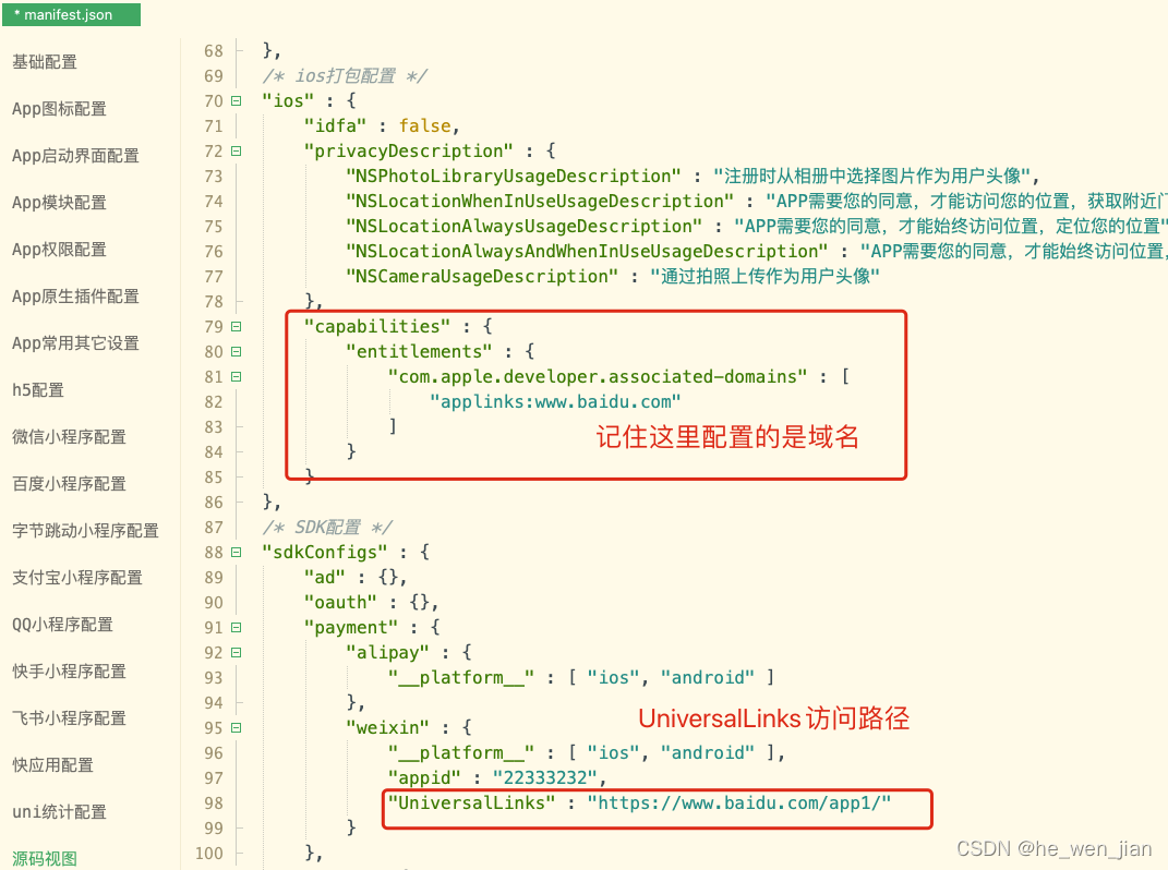 3:配置指定文件:创建一个内容为json格式的文件,苹果将会在合适的时候,从我们在项目中填入的域名请求这个文件。这个文件名必须为apple-app-site-association,切记没有后缀名,文件内容大概是这样子: