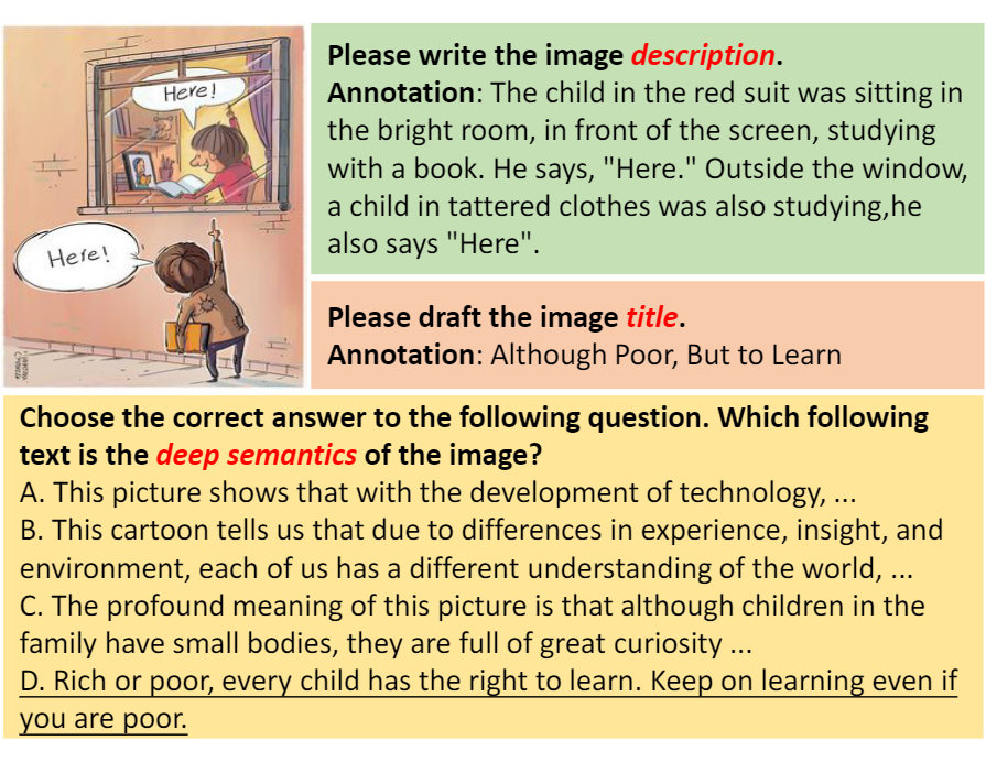图像的深意(Deep Semantics of Images)是指超越表面意义的深层内涵,传达更丰富和更深刻的信息,探究图像的本质。理解图像的深层语义是人类高水平智能的表现之一,也是人类从感知智能向认知智能探索的重要途径。然而,过去图片视觉理解的研究主要聚焦于图像的表面信息,如计数、物体属性、关系推理等。此前对深度语义的工作范围有限,往往局限于幽默、讽刺等方面,且缺乏全面深入的探索。