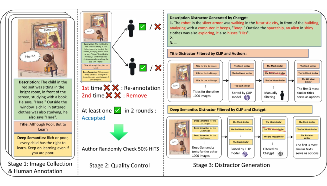 在第三阶段,作者将进一步检查第二阶段的所有结果,以确保标注内容符合我们的标准。最终,我们获得了 1,001 个高质量的数据条目,每个条目都表示为一个四元组(图像、描述、标题、深层语义)。