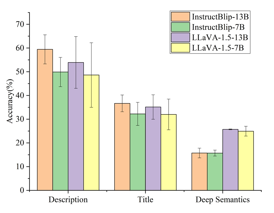 从以上评测结果中,我们发现,所有评估的模型在深意理解方面的准确率显著低于它们在图像描述方面的表现,且几乎所有模型在深意理解方面的准确率也低于在深度标题匹配任务中的表现。这表明理解图像的深意对这些模型来说是一个重大挑战,而关注深意的细节则进一步增加了复杂性。此外,我们注意到,这些模型的能力明显弱于人类的表现,在深意理解方面最为明显,可见模型在图片深意方面还有很大的提升空间。