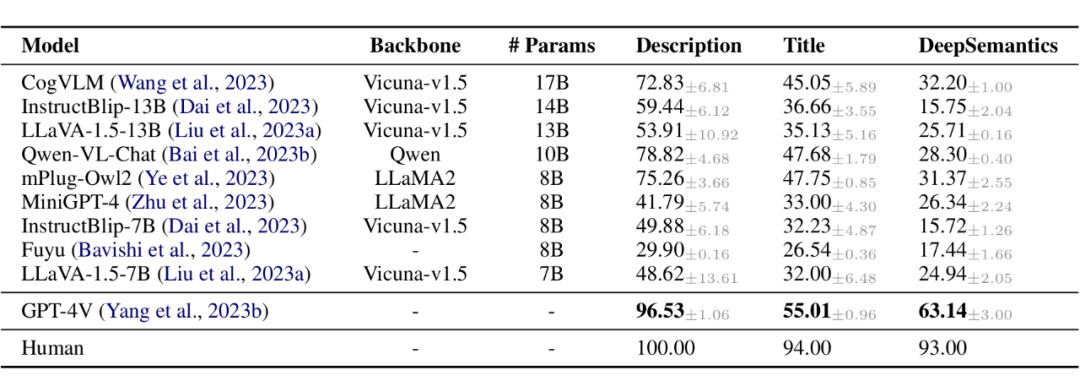 表 2 展示了 DeepEval 对多模态大模型及人类能力的评测结果。其中包括 LLaVA-1.5,MiniGPT-4,mPLUG-Owl2,CogVLM,Qwen-VL,InstructBlip2,Fuyu开源多模态大模型和 GPT-4V(ison)闭源多模态大模型。