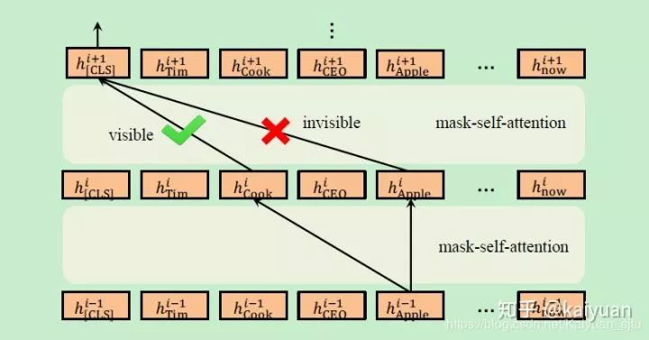BERT中的Transformer Encoder不能接受上述可见矩阵作为输入,因此需要稍作改进。Mask-Transformer是一层层mask-self-attention的堆叠,