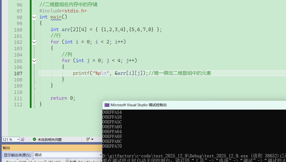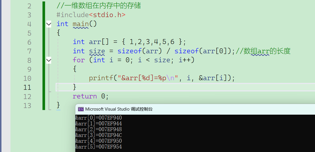 那么上述代码运行结果反映了数组中的元素在内存中是连续存储的。
