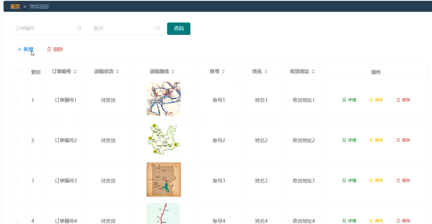 管理员可增删改查物流追踪信息,物流追踪管理界面展示如图5-7所示,添加物流追踪界面如图5-8所示。