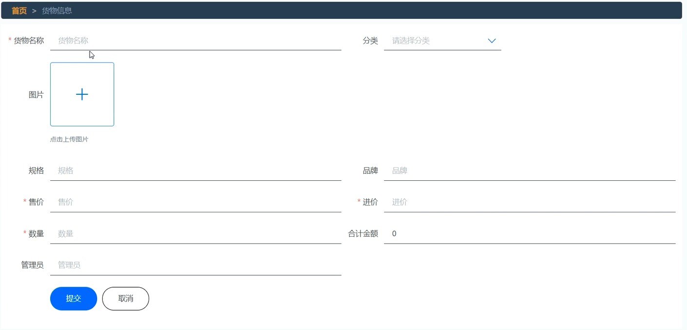 管理员登录后可查询、添加、修改和删除货物信息,货物信息管理界面展示如图5-4所示,添加货物信息界面展示如图5-5所示。