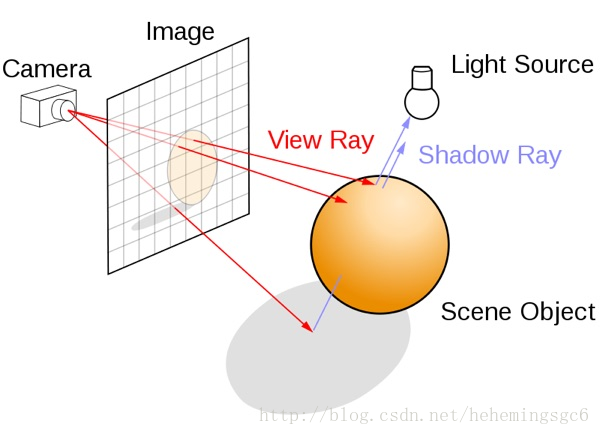 经典的对图像的光线追踪的做法是从镜头处发射一条射线,当其与物体相交时,计算这个点的颜色,并作为这条射线最近的像素的颜色值。通常来说光线追踪会需要获取场景中所有几何体、材质、光照的信息,并使用一个完整的Rendering pipeline来达成。我们也能使用类似的方法,