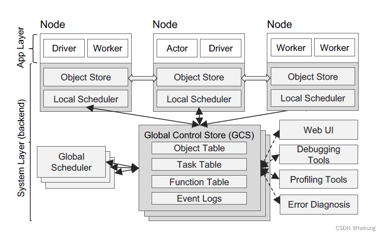 Ray 架构 更准确地说,全局调度器识别具有任务所请求类型的足够资源的节点集合,并在这些节点中选择提供最低估计等待时间的节点。在给定节点上,此时间是(i)任务将在该节点排队的估计时间(即,任务队列大小乘以平均任务执行)和(ii)任务远程输入的估计传输时间(即,远程输入的总大小除以平均带宽)的总和。除非节点过载(即,其本地任务队列超过预定义的阈值),或者它不能满足任务的要求(例如,缺少GPU)。由于调度器首先尝试在本地(即,在调度层次结构的左侧)调度任务,因此我们将其称为自底向上的调度器。