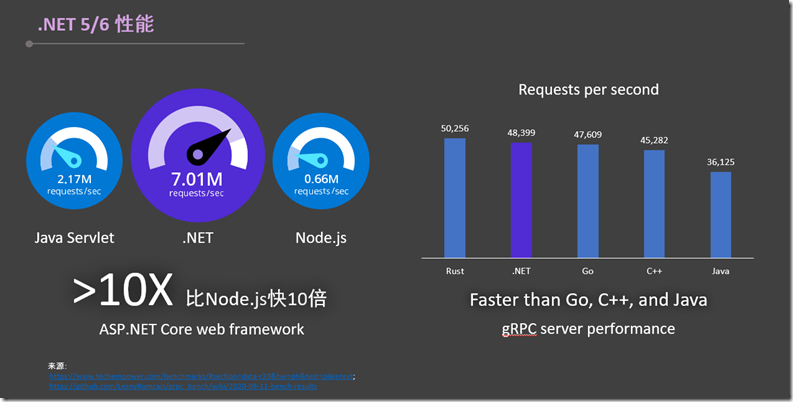 NET 在每次升级时,性能都会成为焦点。比如 NET 6 的 ASP.NET Core 网络应用程序比 Node.js 快10倍, gRpc 的 .NET 实现是性能最好的,超过了 C++ 的实现。在 .NET 6 中,还专注于加快 Web 应用程序性能,降低资源的占用,换句话说就是对云原生的投资。
