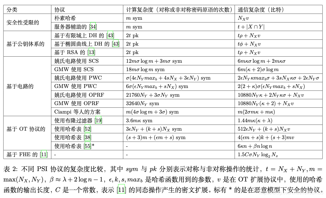 下表给出了一些常见的PSI算法及其计算和通讯复杂度: