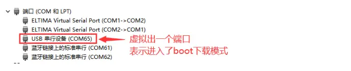 在电脑的设备管理器中,查看串口设备,如果出现了一个端口,则表示成功进入BOOT下载模式,如下图所示: